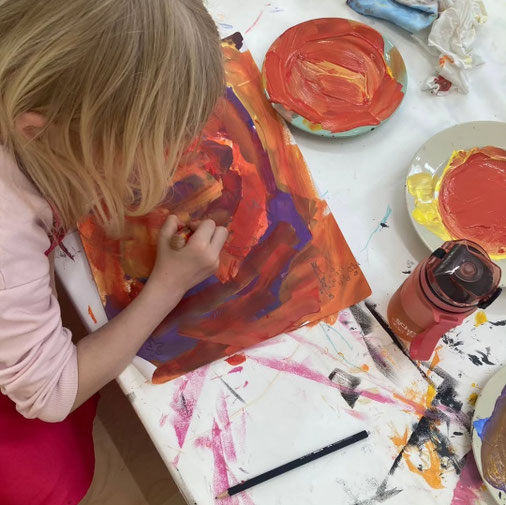 Besonders jüngere Kinder gehen unbefangen und neugierig an Kunst heran. Formate, Farben und Materialien sind für sie spannende Mittel, um sich auszuprobieren und ihre innere Welt auszudrücken. Ihre Fantasie kennt dabei keine Grenzen – genau das machen wir uns in unseren Kursen zunutze.